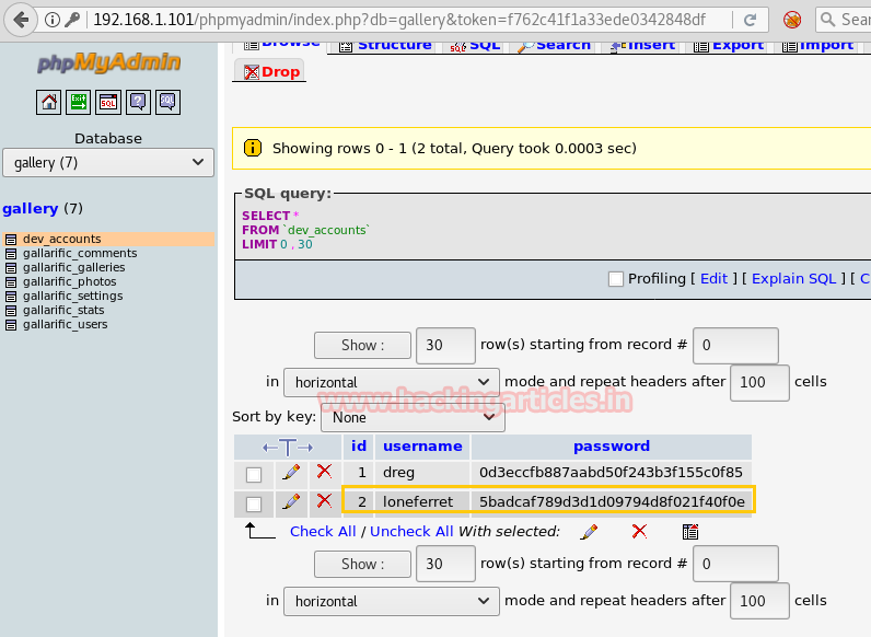 Upon further scan for the gallery database and specific table dev_accounts, we happen to find out 2 usernames as listed below