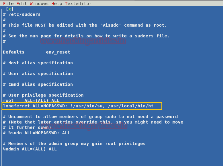 As per the output, the user loneferret is allowed to run HT Editor as sudo and that there is no password (NOPASSWD) set for this user while executing the command /usr/local/bin/ht