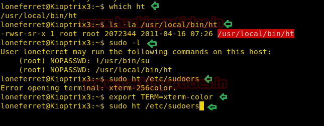 Note: sudo ht will allow editing any file on the system. Hence we will edit the /etc/sudoers file. Before editing the sudoers file make sure to export TERM so we can use graphical component of our command