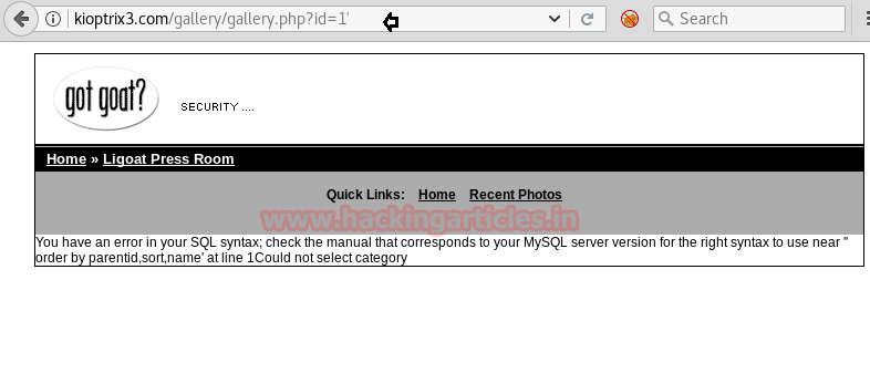 After navigating through the site, I found that by clicking on sorting options and photo id, the URL had a parameter of “id” which could signify a vulnerability to SQL injection. After putting ‘ after php?id=1 , i.e (by trying with http://kioptrix3.com/gallery/gallery.php?id=1’ ) the SQL error prompt appears. Hence this means that URL is prone to SQL injection.