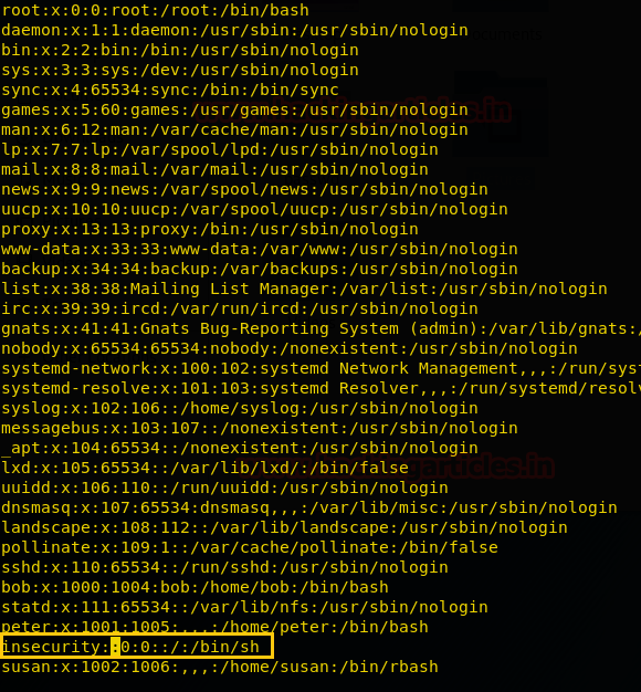 So, as you can observe that now we are having modified passwd file where user insecurity has an entry with UID: GID 0:0 and no password.