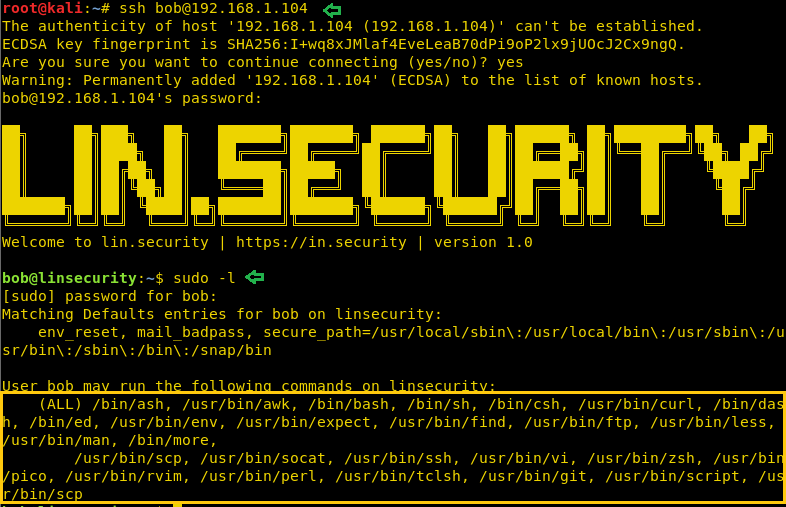 After ‘logging in’ I tried to check the sudo rights for user bob:
