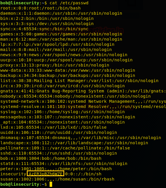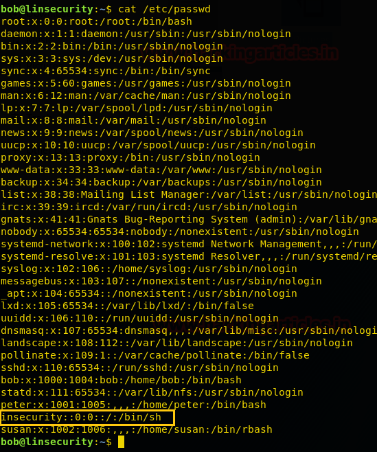 So, as you can observe that now we are having modified passwd file where user insecurity has an entry with UID: GID 0:0 and no password.