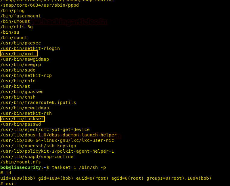 Here xxd and taskset are system binaries file having suid permissions and with this, we can spawn the interactive system shell and can get away from low-privilege environments.