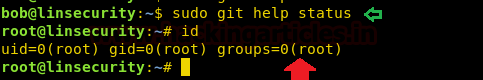As we know it opens the file in vi mode and since you have run the command with sudo right which means we can get a shell through it. Execute !bash command inside git status file as shown above and you will get a root shell.