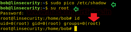 Since we know that pico is a text editor such as nano and vi also has sudo permission, which means that now we can also edit system files. Now open /etc/shadow file with pico editor and try to modify the root password.