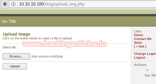 Upload image option opens a simple Upload webpage. Let’s try to upload the php-reverse-shell.php which is inbuilt in Kali Linux from path: /user/share/webshells/php. Although uploading PHP files most probably will be not allowed.
