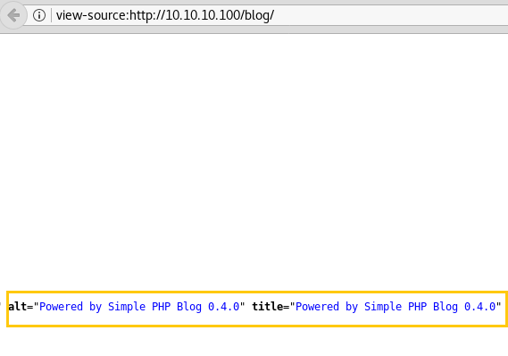 And as I closely inspected the source code, I ran into the line shown in the screenshot, it is an important hint as it tells us that the Website runs on Simple PHP Blog and the Version 0.4.0.