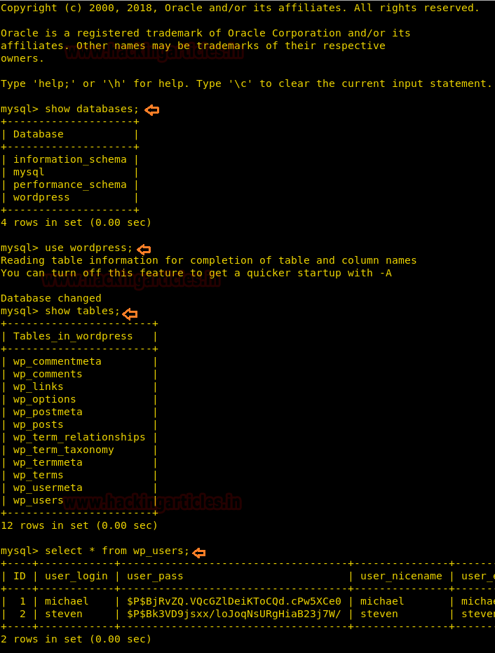 show databases; use wordpress; show tables; select * from wp_users;