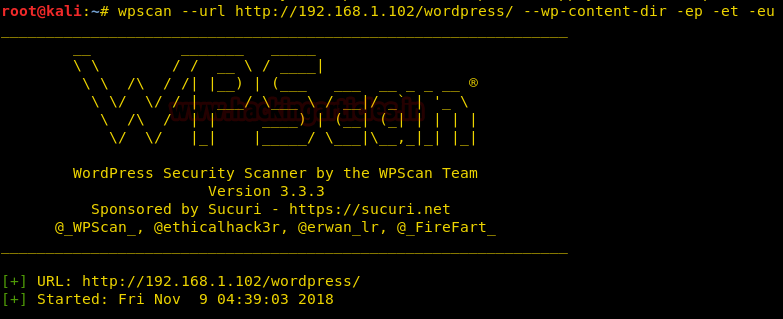 wpscan --url http://192.168.1.102/wordpress/ --wp-content-dir -ep -et -eu