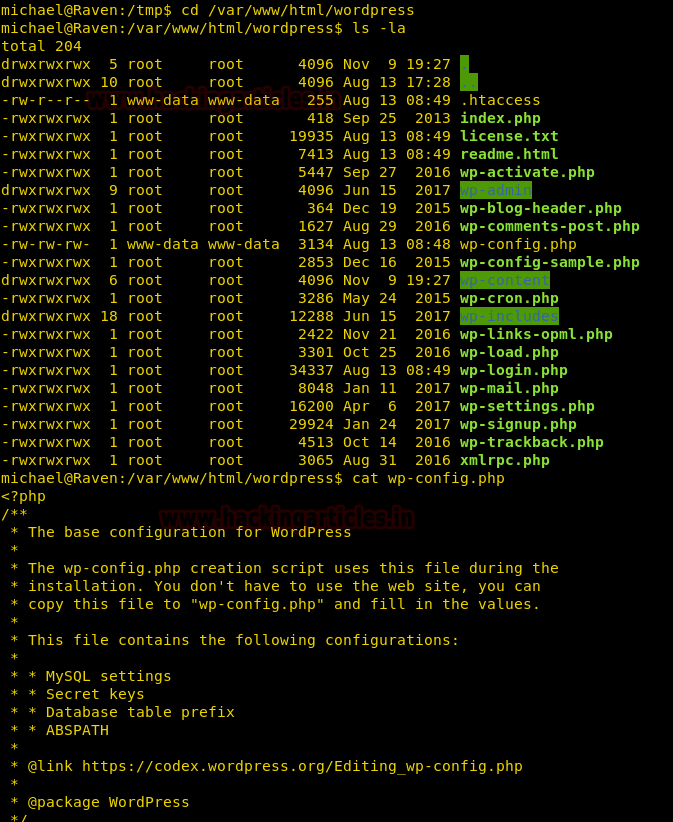 So, we changed the current directory to /var/www/html/wordpress and searched for the wp-config file, since it will have the password to the MySQL database.