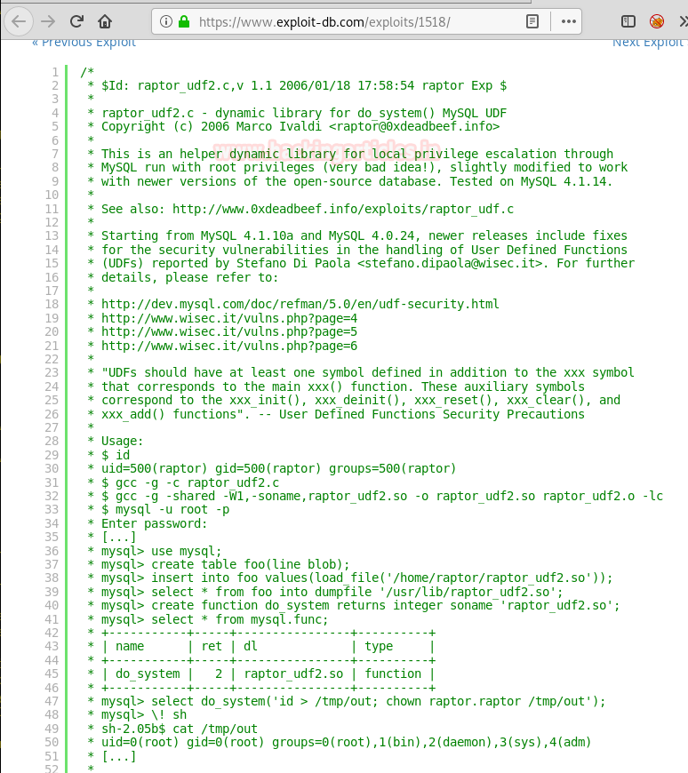 So, we searched for a UDF dynamic library exploit and it was named “1518.c” in the exploit database.