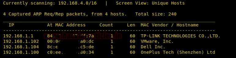 Discovering the active devices on a network using netdiscover and getting the IP address of our victim machine. In this case, the IP address holds 192.168.1.102