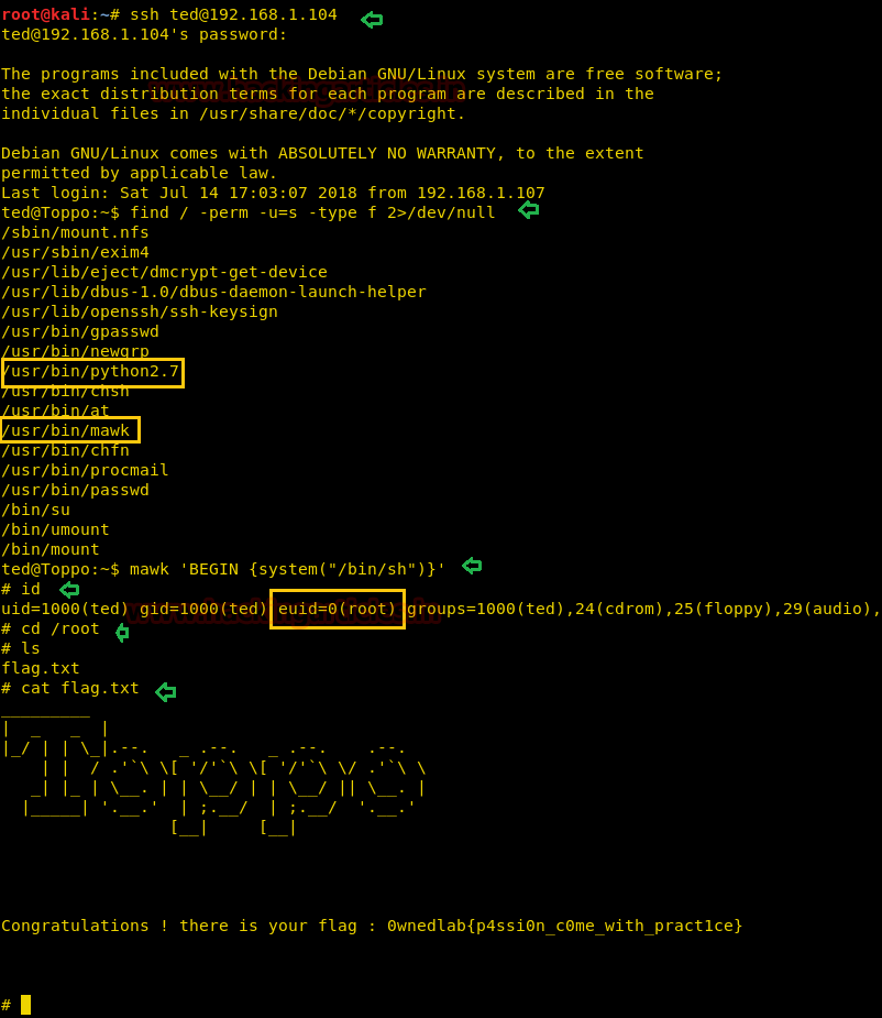And it dumped all system binaries which have SUID permissions but /usr/bin.mawk and /usr/bin/python2.7 are at my target point for escalating root privilege through them. So I had exploited this VM twice to root access.