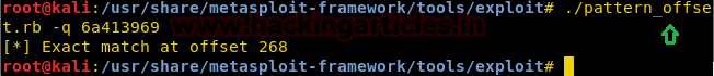 We pass that into /usr/share/metasploit-framework/tools/pattern_offset.rb, we get an offset of 268. So we need to write 268 characters and then write the address of the instructions we want to be executed.