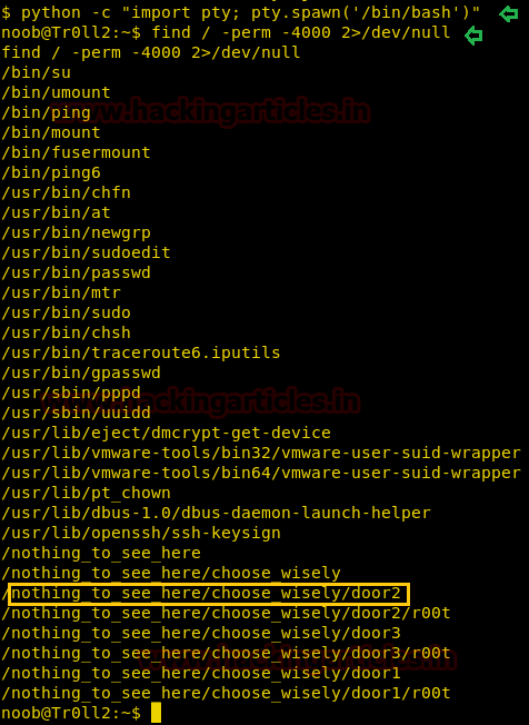 The r00t binary in these directory work differently and change their behavior with each other on every reboot. One of these binaries (in our case it was in door2, it changes on reboot) accept a string as an argument and print it.