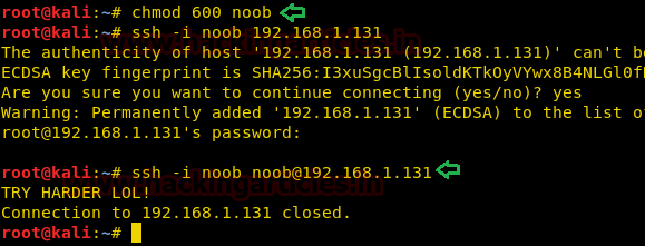 chmod 600 noob ssh –i noob noob@192.168.1.131