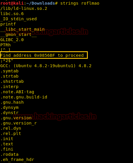 Then with help of “string” a tool in Kali Linux, we explored the file roflmao and got a message ‘Find the address 0x0856BF to proceed’