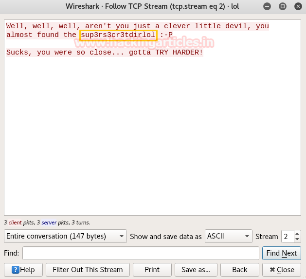 While looking in TCP stream 2, I notice something suspicious “sup3rs3cr3tdirlol” it could any possible web directory. So let’s step up for further approach and figure out what this sup3rs3cr3tdirlol indicates.