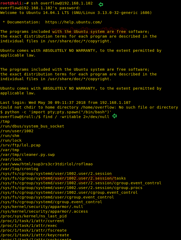 ssh overflow@192.168.1.102 find / -writable 2<dev/null