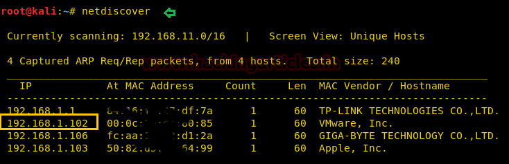 Start with the netdiscover command to identify target IP in the local network, in my network 192.168.1.102 is my target IP, you will get yours.