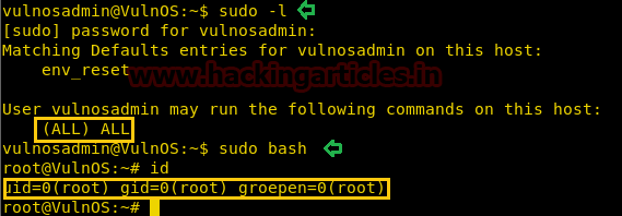 On performing sudo -l, we observed that vulnosadmin has no restrictions set and has the privilege to run ALL commands with sudo