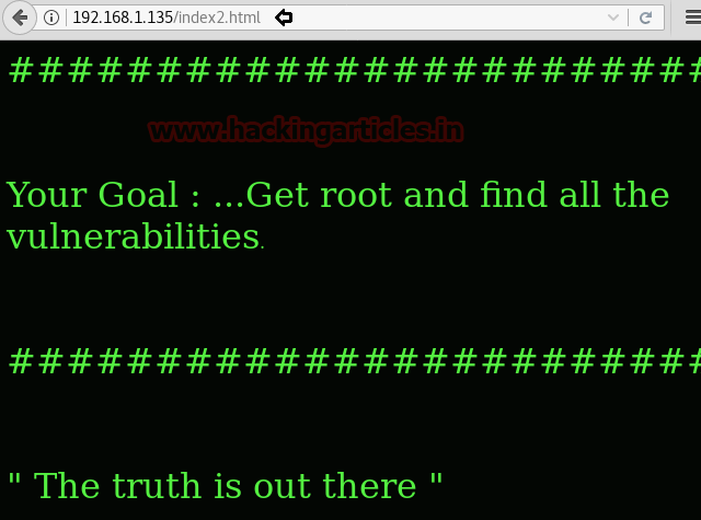 The webpage is welcoming us to VulnOS and giving us a statutory warning about not using the OS on a Live Environment. It consists a “next page>” link too. After clicking on it we are told that our goal is to get root on the Target VM.