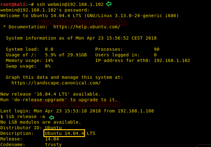 Password turns outs to be webmin1980 with the username of webmin. As we have username and password we can log in through SSH port. And to log in through SSH open a new terminal in kali and type: