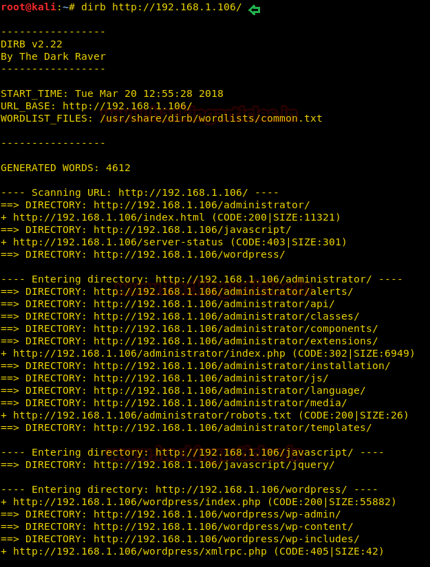 Next, we use the dirb tool of kali to enumerate the directories and found some important directories such as /administrator /installation and /wordpress/