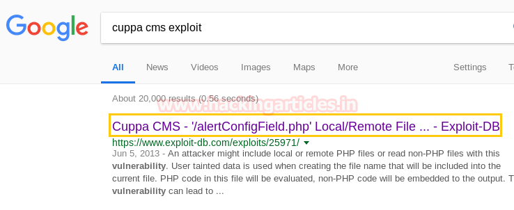 With the help of Google I check out for any exploit related to cuppa CMS. And from Google search result, I found exploit 25971 in its first link.