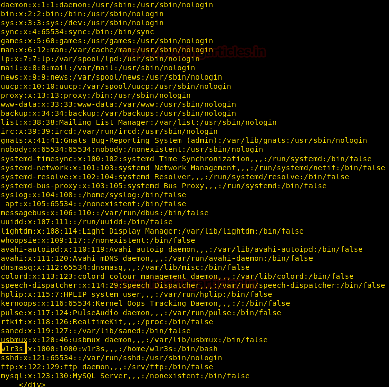 When I executed the above command for exploring etc/password file, it successfully works and I found the first username “w1r3s”.