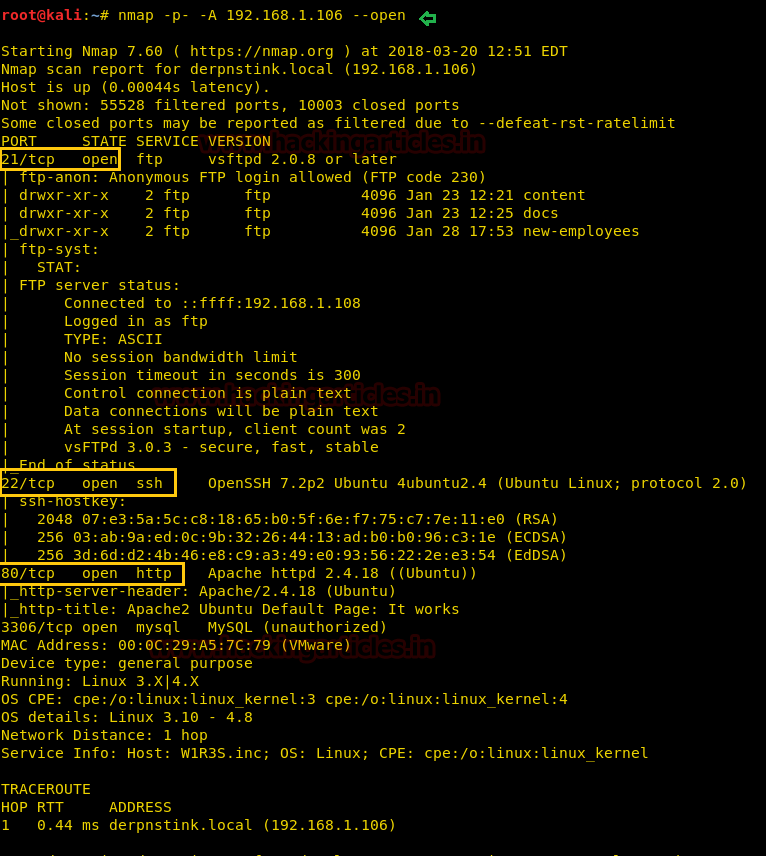 Awesome!! Nmap has done a remarkable job by dumbing the details of services running on open port 21, 22 and 80.