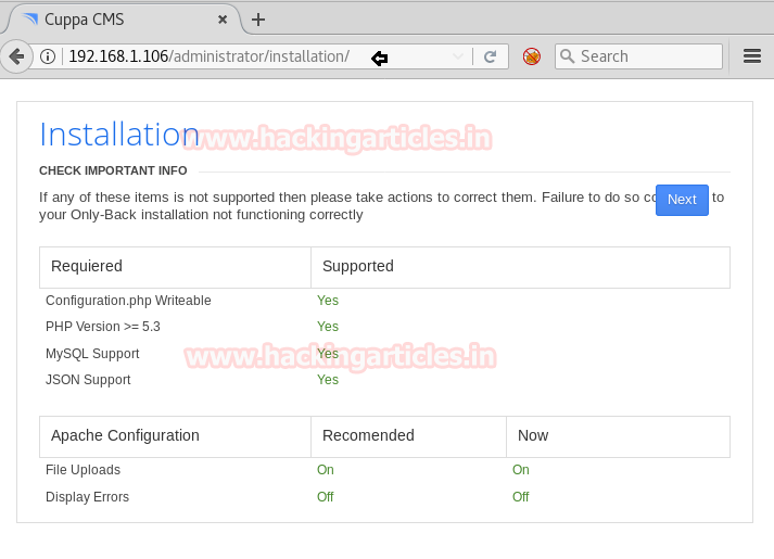 So next I decided to explore http://192.168.1.106/administrator/installation through browser URL and received installation page as shown in given below image. Moreover noticed that the author has used Cuppa CMS.