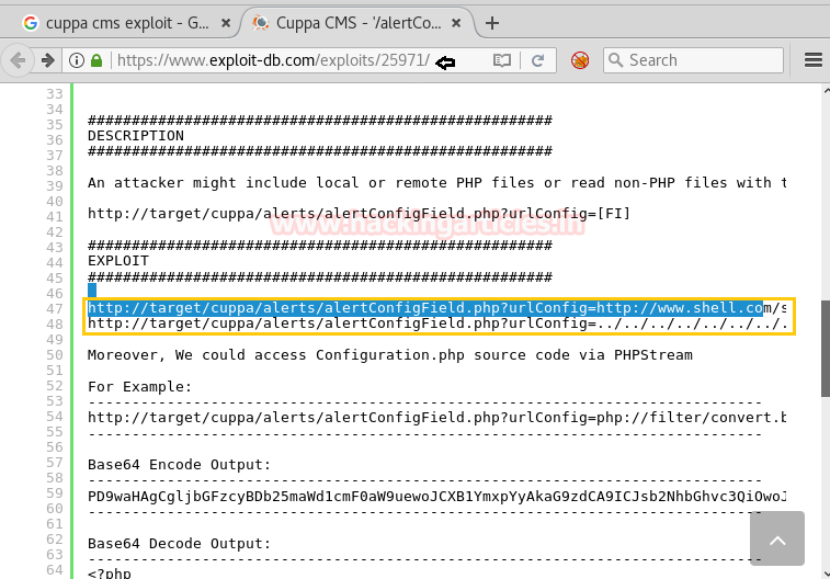 With the help of Google I check out for any exploit related to cuppa CMS. And from Google search result, I found exploit 25971 in its first link.