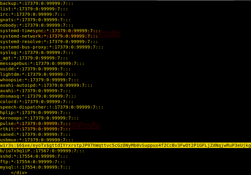 Successfully I found the salt password of user w1r3s as shown in given below image. Then I copied this password in a text file as pass.txt for cracking it with John the ripper.