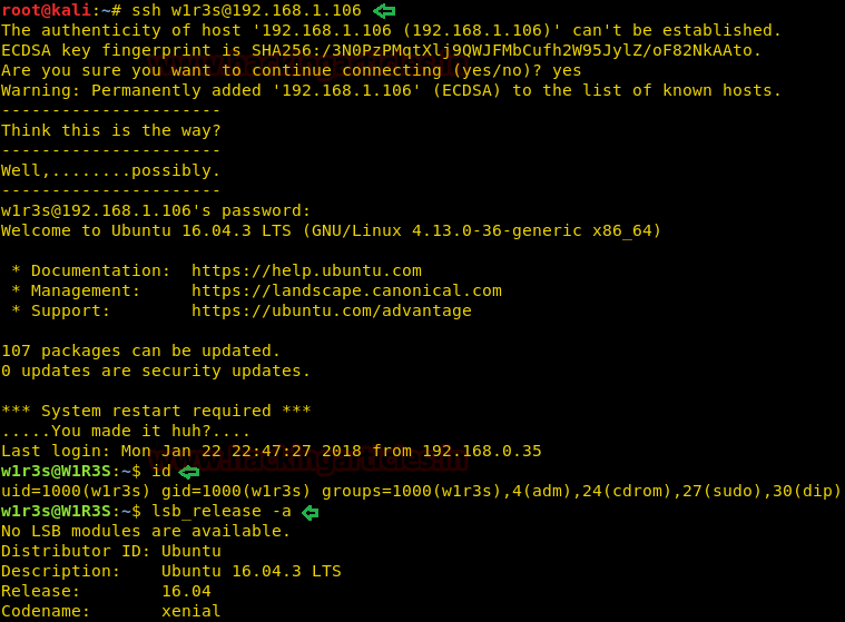 If you remember the output result of nmap then it was showing port 22 is open for SSH. We had also grabbed the username and password, now without wasting timing let login into SSH using above credential username: w1r3s and password: the computer.