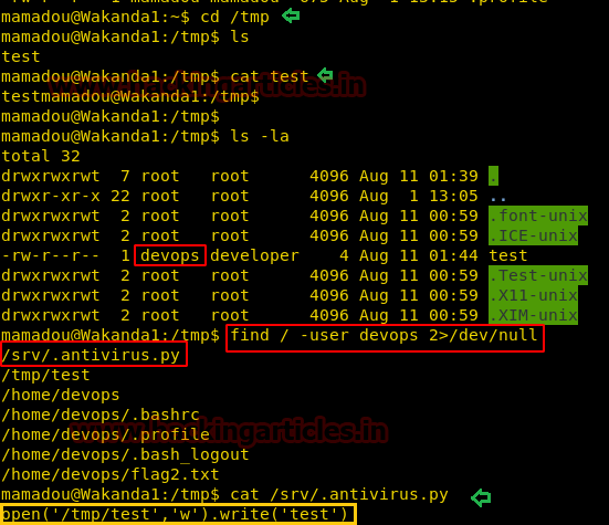 Enumerating through the directories, inside /tmp directory we find a file called test. We open it and find nothing interesting, but when we take a closer look at the file we find it that is owned by a devops. Now we find all the files owned by user devops and find a file called “.antivirus.py” inside /srv directory.
