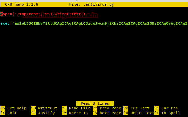 After creating the payload, we open the “. antivirus.py” file and comment out the earlier code and insert our payload without adding “python -c”.
