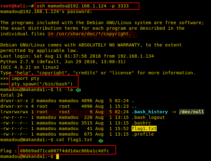 When we login through ssh we get a python IDE prompt. We import the pty module and spawn ‘/bin/bash’ shell. We take a look at the home directory for user mamaduo and find the first flag.